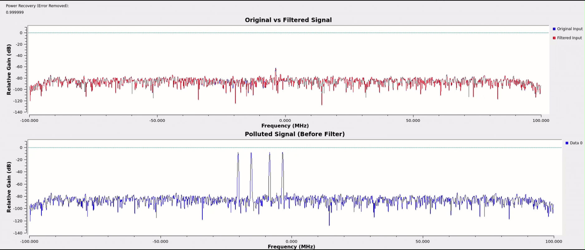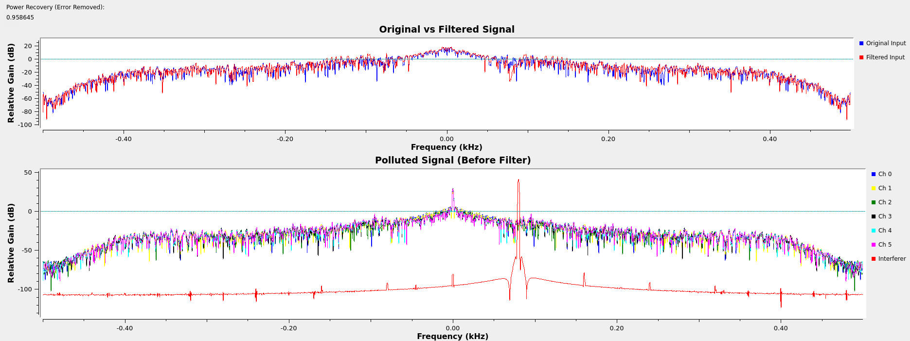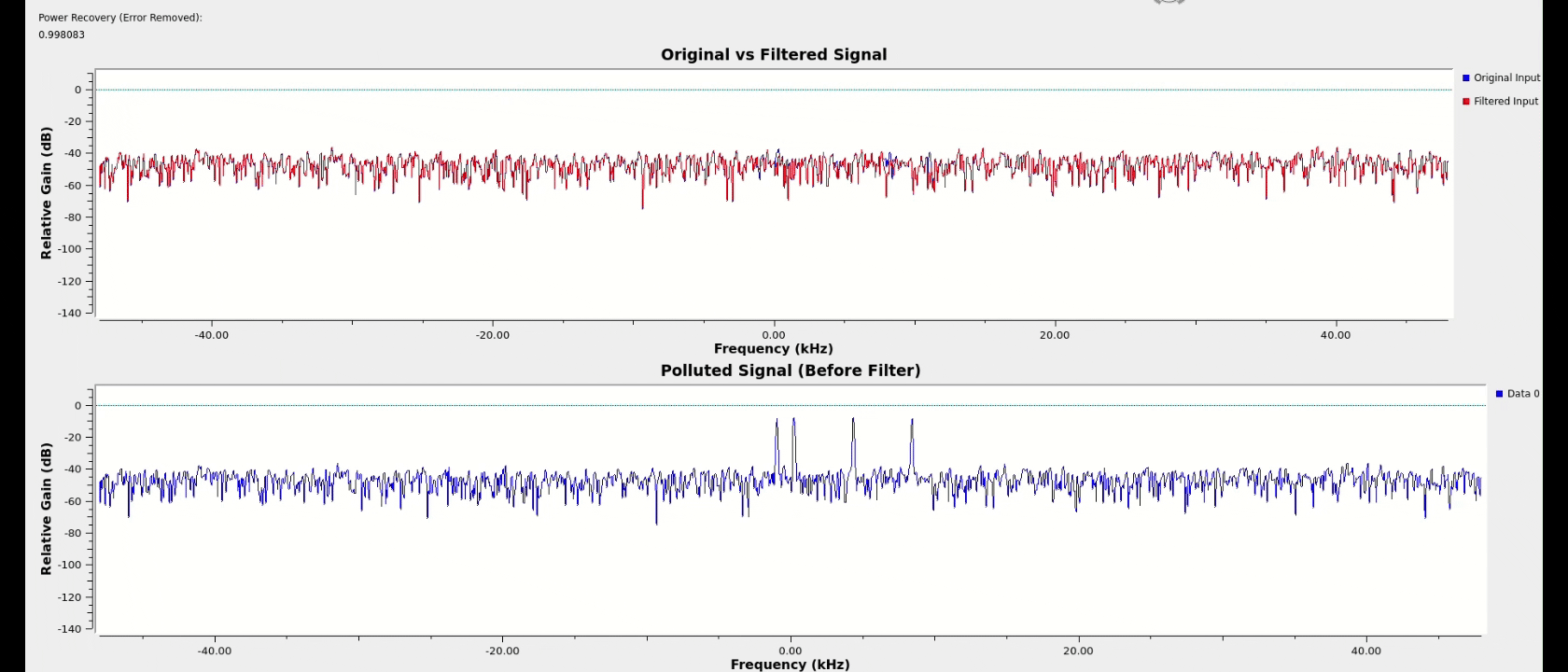 One unanticipated benefit of the cascaded architecture is that as the number of notches allowed to generate increases beyond the number of interferers, the extra notches will work to exponentially attenuate the small spurs still being produced by the primary notches. By allowing for a few extras beyond the number of spikes anticipated and with some threshold tuning, nearly perfect spectral power recovery was achieved across most test cases for various signal types.