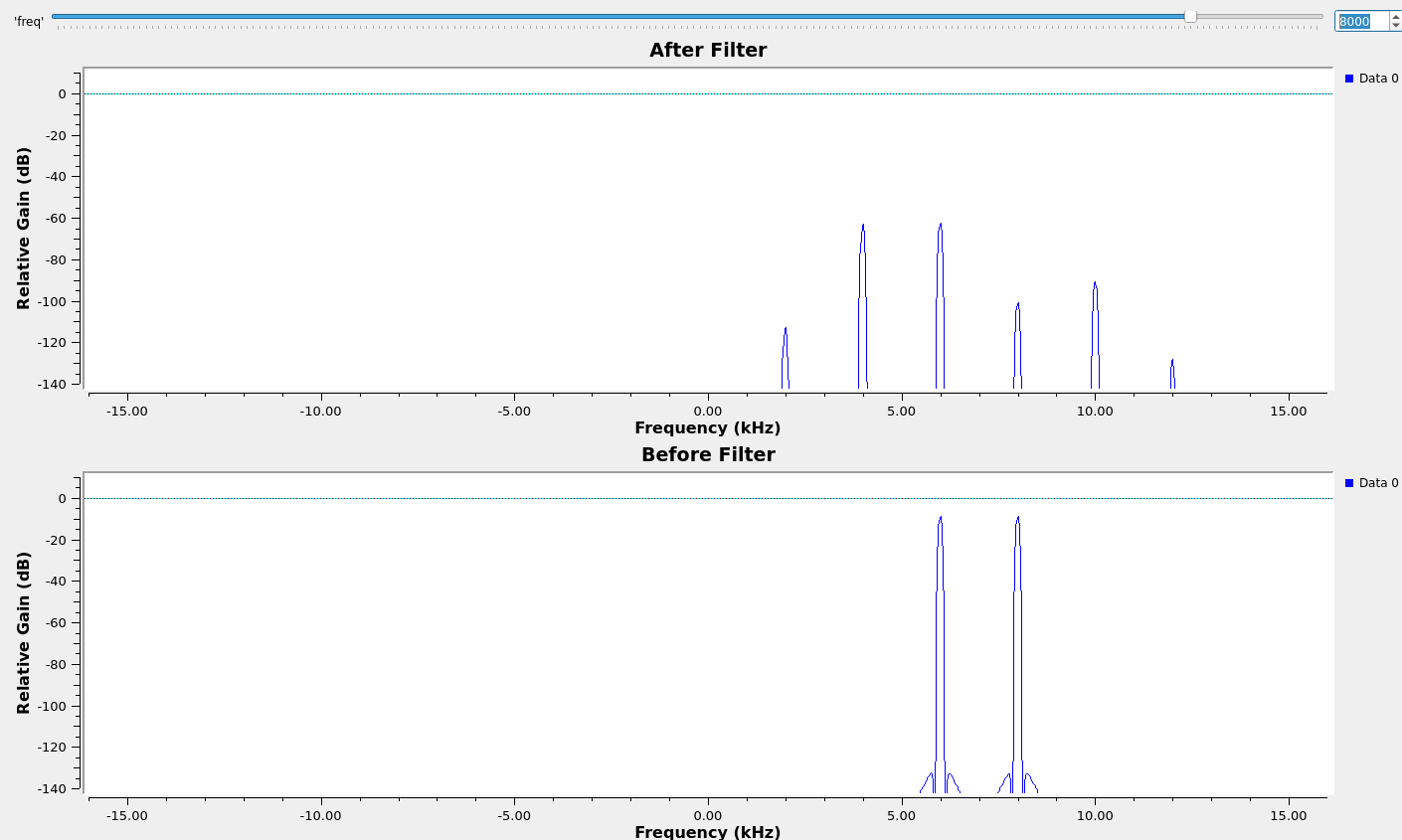 - I decided to try replacing the latch with a more elegant update smoother. This would use the gradient to persistently declare a target $\omega_\triangle$ and then continuously slew the update towards this value in order to prevent spectral lines emerging from discontinuously varying updates. By tuning the smoothing parameters, I achieved a maximum amplitude of -75dB for the interferers and sidebands in the worst (closest) case, and very successful attenuating when interferers were farther apart.
