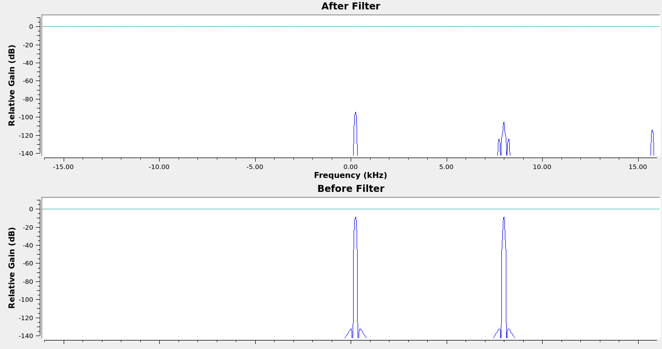 At one prototype stage, the adaptive filter was able to track and settle on a single stationary interferer. However, the use of a slower (every 8 sample) update rate for $\omega$ produced spectral lines at $f_s/8$ intervals. I fixed this by simply updating $\omega$ per-sample with no significant performance penalty, but it was a good lesson learned about the consequences of introducing period behavior into a filter function. I also imposed an upper bound of $50 Hz$ on how much $\omega$ could move per update, since this also contributed to some sideband generation.